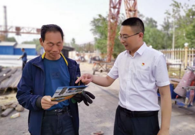 兴固村党组织书记陈相楠(右)深入企业走访宣传安全生产