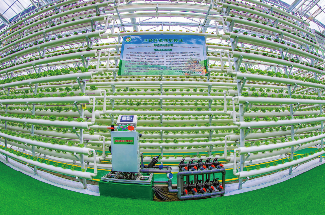 山东省兰陵县代村农业科技馆始建于2018年年底,是一处运用了“农业4.0生态系统”标准建造的现代化智能温室,在原有智能化温室标准要求的基础上,突出了光伏补光、智能水肥一体化、生物物理病虫害防控防治、物联网平台智能调控等四项新技术。无土栽培立体种植专利技术将成熟的立体管道种植模式从固定化运营转向“可复制、小型化”,打破应用场景的局限,逐步向外辐射,让技术具备了“易推广、强辐射”的特性,既能适配涉农企业的规模化生产,也能满足家庭农场的小型化需求。